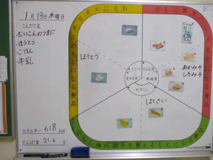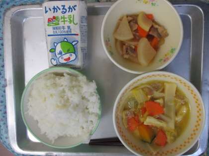 今日の献立は,牛乳・ごはん・ほうとう・大根のうま煮です