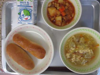 今日の献立は,牛乳・ミニパン・揚げパン・卵入りスープ・ポークビーンズです