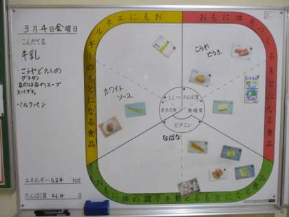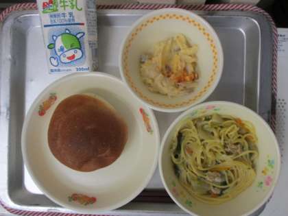 今日の献立は,牛乳・ミルクパン・菜の花のスープスパゲティ・高野豆腐のグラタンです