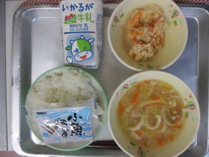 今日の献立は,牛乳・ごはん・あんかけうどん・かき揚げ・小魚の佃煮です