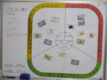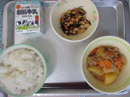 今日の献立は,牛乳・ごはん・肉じゃが・豆とひじきのサラダです