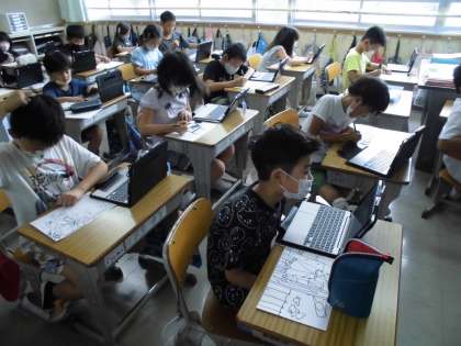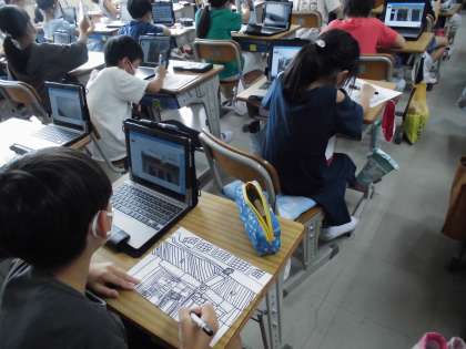 タブレットで写した学校の風景を,一生懸命画用紙に書いていました。