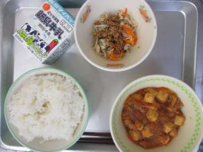 今日の献立は,牛乳・ごはん・マーボー豆腐・ナムルです