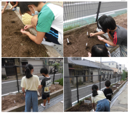 人参の種は小さくて,びっくり!筋蒔きを学び,種が重ならないように慎重に置きました。休み時間には,積極的に水やりを頑張っています!
