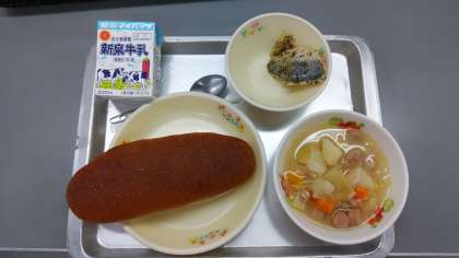 献立は,黒糖パン・牛乳・スープ煮・あじの香草チーズ焼き です。