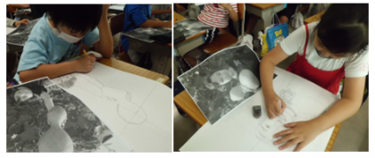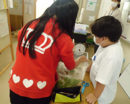大根の間引きをしました。間引き菜がたくさん採れてにっこり。虫を見つけ,仲良く観察しています。