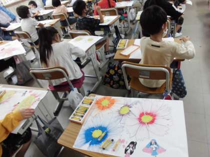 画用紙いっぱいにコスモスの花を描いています。 教室が花畑のようでした。