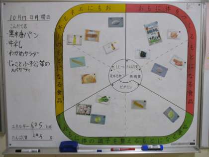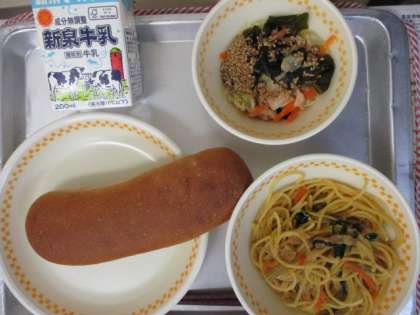 今日の献立は,牛乳・黒糖パン・じゃこと小松菜のスパゲティ・わかめサラダです