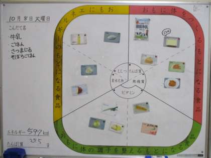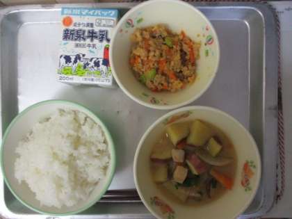 今日の献立は,牛乳・さつま汁・そぼろ丼です