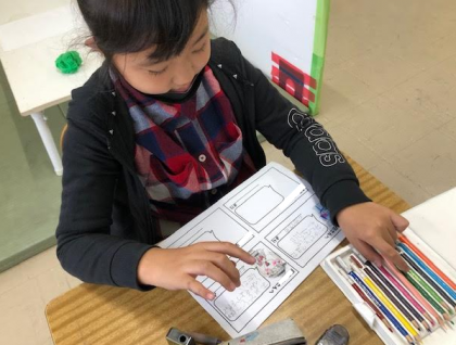 気持ちを込めて絵やメッセージをかいています。休み時間にも自主的に進めていました。