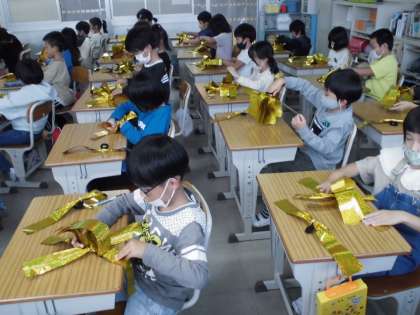 教室で,腕に巻く金のキラキラを作りました。