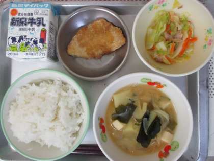 今日の献立は,牛乳・ごはん・みそしる・キャベツのソテー・アジフライです