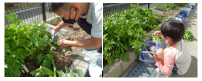 大根の間引きをしました。間引き菜を持って帰れると聞き,喜んでいました。