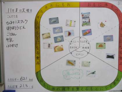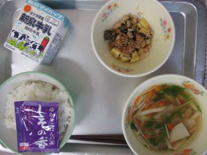 今日の献立は,牛乳・ごはん・はりはりうどん・ひみこスナック・ふりかけです