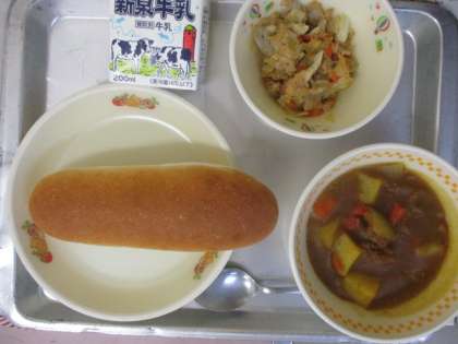 今日の献立は,牛乳・コッペパン・ポークカレーシチュー・レンコンサラダです