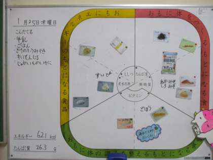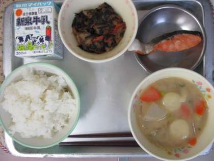 今日の献立は,牛乳・ごはん・すいとん汁・じゃがいもの磯煮・鮭の風味焼きです。