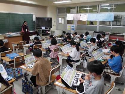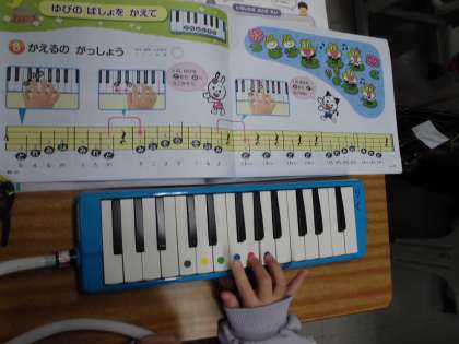 鍵盤ハーモニカで「かえるのがっしょう」を吹いています。