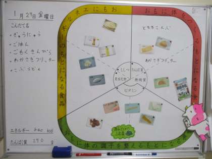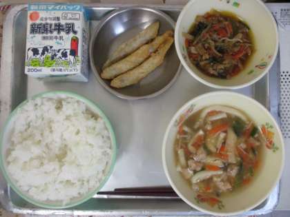 今日の献立は,牛乳・ごはん・こぶうどん・五目きんぴら・ワカサギのフリッターです