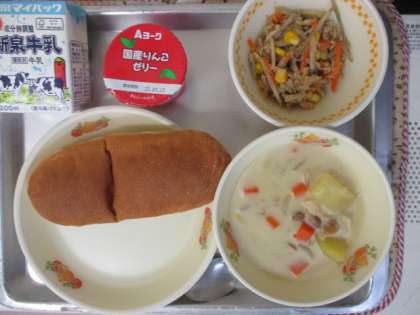 今日の献立は、牛乳・コッペパン・クリームシチュー・ごぼうサラダ・フルーツゼリーです