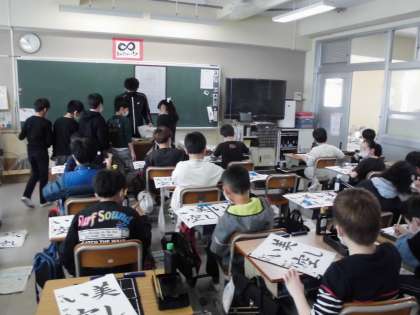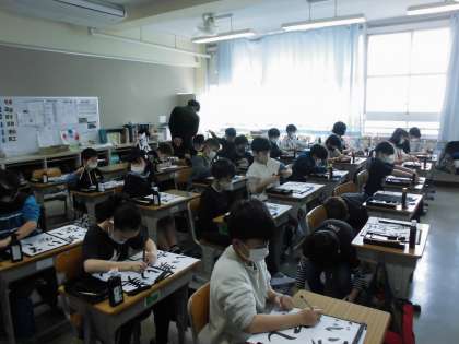 「美しい空」を清書しています。 名前までていねいに書いていました。