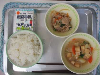 今日の献立は、牛乳・ごはん・五目汁・豚肉の生姜炒めです