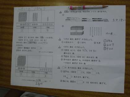3けたの数の位取りをプリントで復習していました。