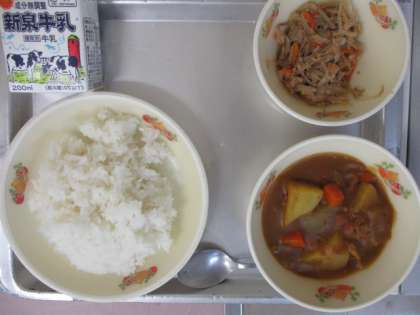 今日の献立は、牛乳・ポークカレーライス・ツナごぼう炒めです