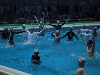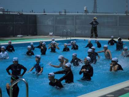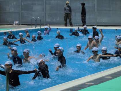 みんながプールに入り、水慣れの運動に新堺っ子体操を水中でしました。