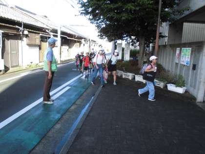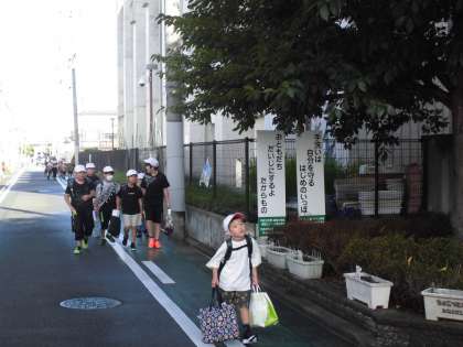 雨上がりの明るい青空の下、大きな荷物は夏休みの宿題でしょうか。