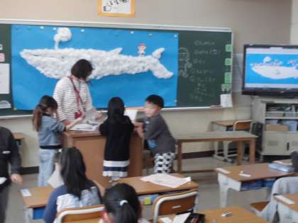 雲でできた「くじらぐも」に乗る自分の絵を描いてくじらぐもに乗せていきます。