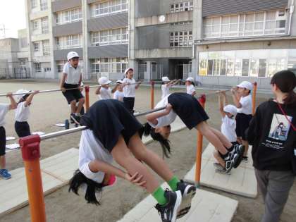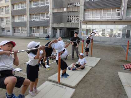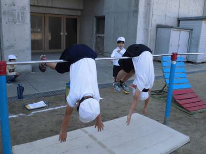 鉄棒で「ふとんほし」を練習しています。 高い鉄棒にも挑戦しました。