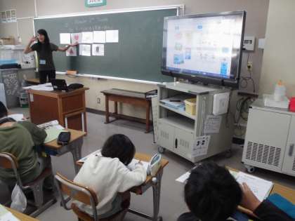 好きな色と形を選びプリントに書きました。 それを友だちに英語で説明をしています。