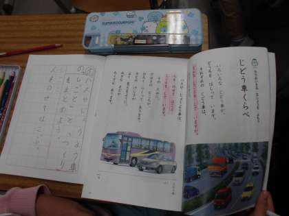 「じどう車くらべ」の勉強で、バスの説明を読み取りました。