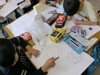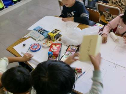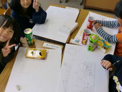 たくさんの箱を使って、形遊びをしました。つつの形で丸を、はこの形で□を描いていろいろなものを表現しています。箱の準備のご協力、ありがとうございます。