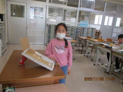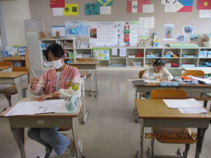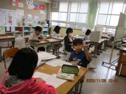 1年生はくりさがりのひき算、2年生は「自分で作ったおもちゃ」を前に立って説明しました。3年生は「すがたをかえる大豆」の学習をしました。4年生は伝統文化のリーフレット作りの下書きをしました。6年生は国語のテストをしました。それぞれの学年の課題に取り組みました。