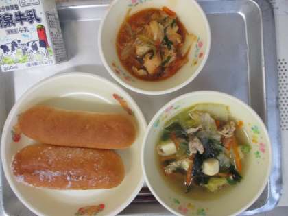 今日の献立は、牛乳・ミニパン揚げパン・わかめスープ・タッカルビです