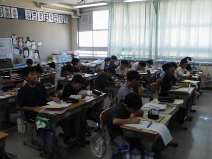 英語のスピーチを見て、聞き取ったことをプリントに書いています。