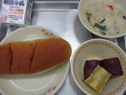 今日の献立は、牛乳・コッペパン・白菜とチンゲン菜のクリーム煮・やきいもです