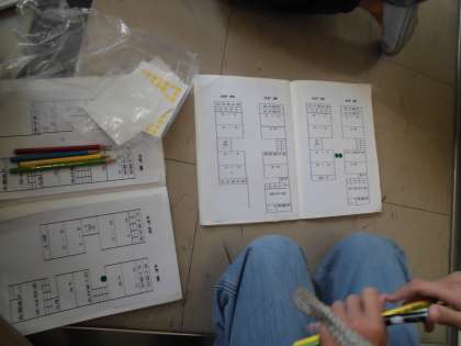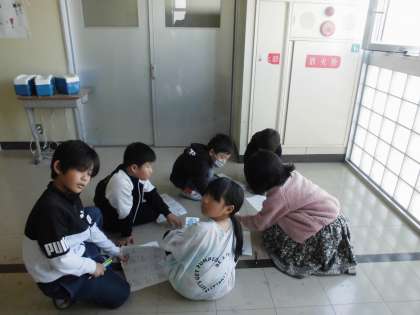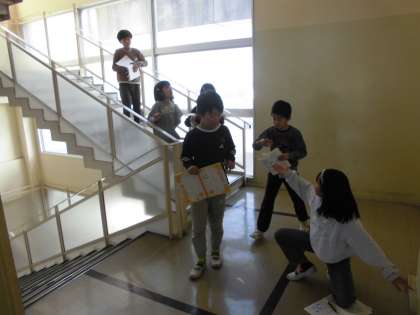 消火器、消火栓、火災探知機を見つけて、校舎の地図にシールを貼りました。