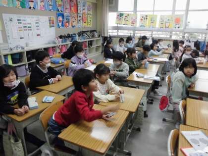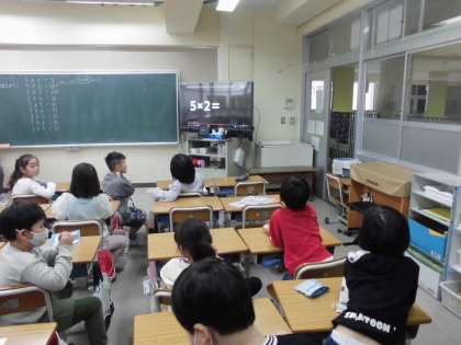 テレビに映った九九の問題に素早く答える練習をしています。 映った瞬間に答えられる子もいました。