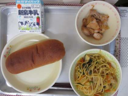 今日の献立は、牛乳・黒糖パン・中華風炒め麺・アドボです
