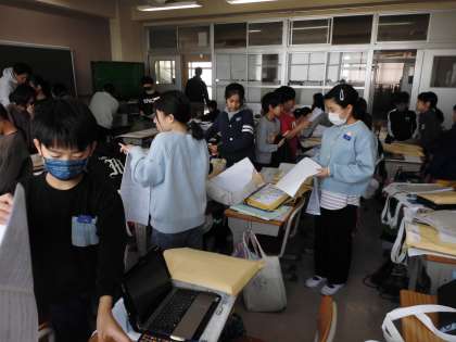 絵や作文などこれまで作った作品を配りました。 思い出を整理していきます。