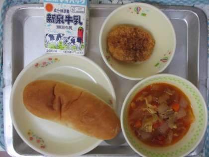 今日の献立は、牛乳・コッペパン・ミネストローネ・コロッケです