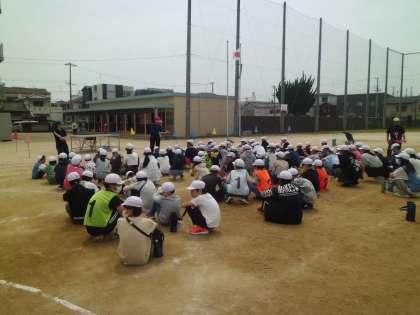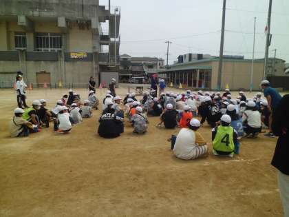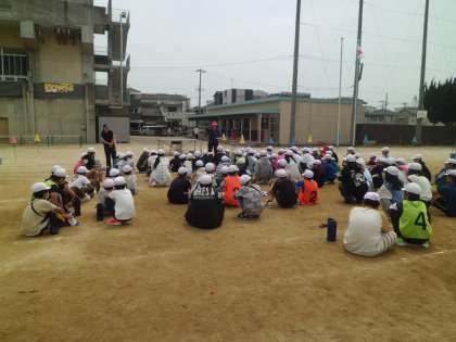 午後、6年生全員が分担して、体育大会の準備や応援団の練習を行います。最初に6年生全員が運動場に集まりました。