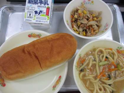 今日の献立は、牛乳・コッペパン・小松菜タンタンメン・ごぼうサラダです