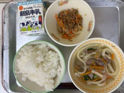 今日の献立は、牛乳・ごはん・肉うどん・ごま酢かけです