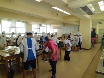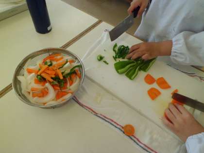 家庭科の調理実習で、野菜炒めとスクランブルエッグを作っています。
