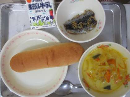 今日の献立は牛乳・コッペパン・いわしの香草焼き・パンプキンスープです。