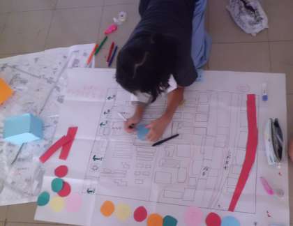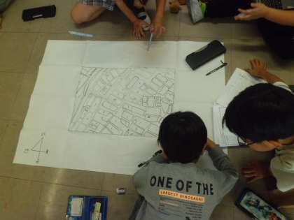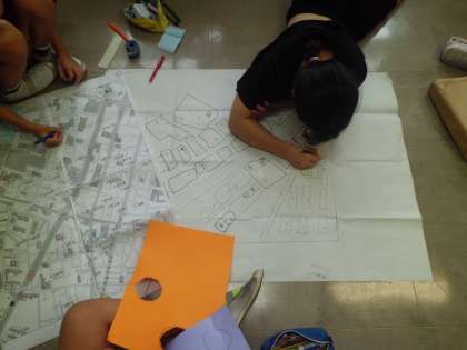 先日行った校区探検の結果をまとめ、防災マップを作成しています。
