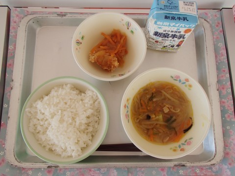 給食場前のサンプルケースの飾りは、調理員さんたちが作ってくださっています。